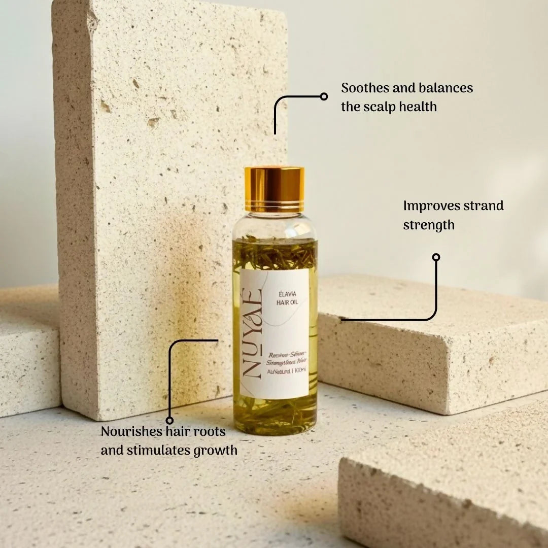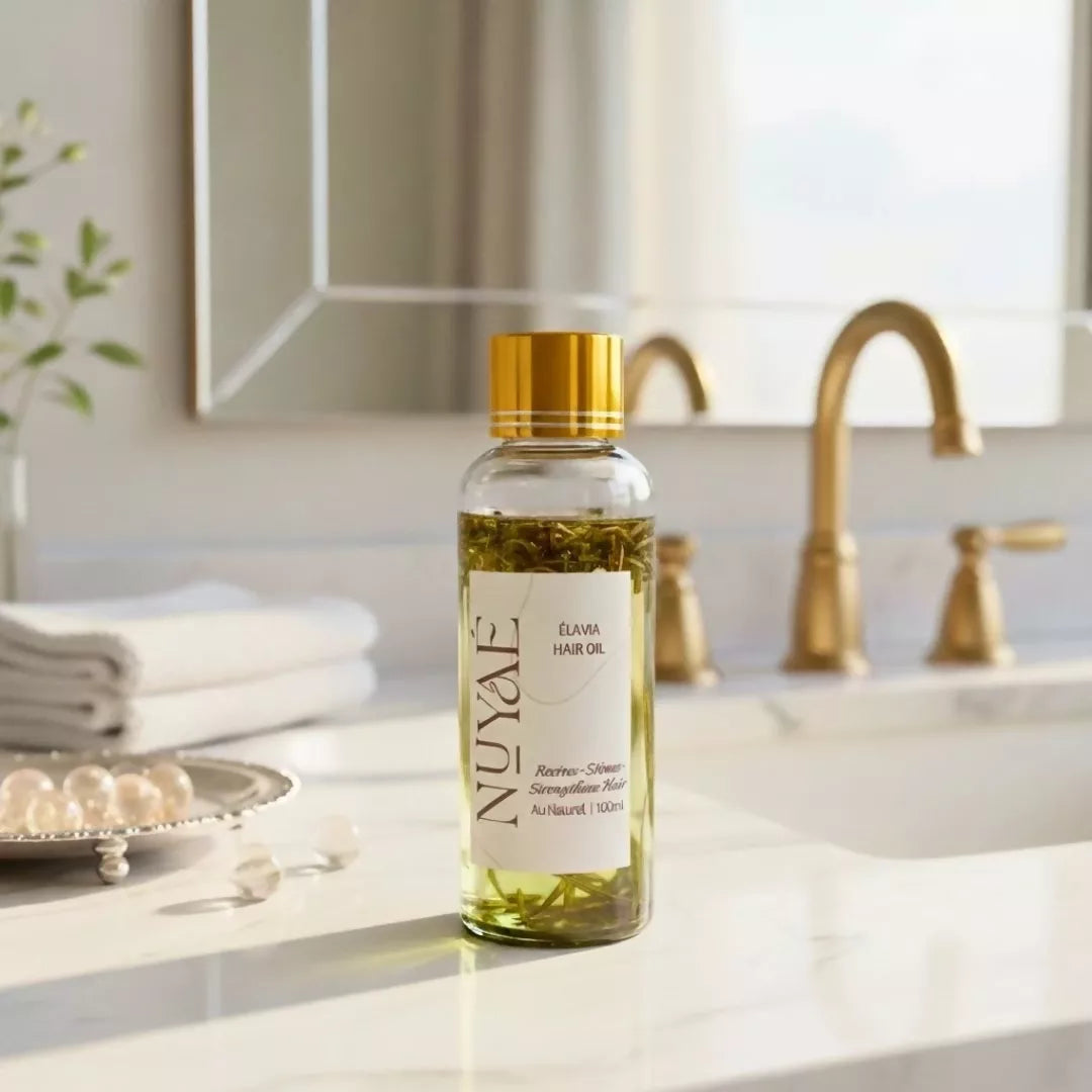 Élavia is a celebration of time. Rosemary, once a symbol of fidelity, and lavender, long associated with calm and healing, rest together in nourishing oils. Nothing is hurried; time itself becomes an ingredient. The result is a blend rich with the quiet strength of leaves and the steady nourishment of oils, leaving scalp and strands soothed, soft, and fully revived—a reminder that nature thrives when it is allowed to unfold at its own pace.